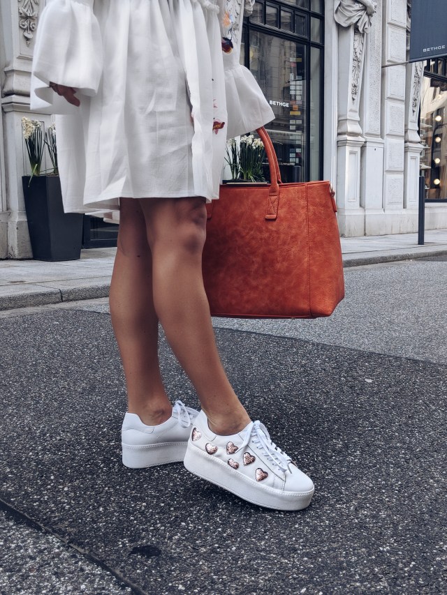 Ich habe mir ein weißes Kleid, eine orangefarbende Tasche, eine dunkle Jeansjacke und weiße Sneaker mit Herzchen bestellt. Den Look zeige ich euch hier: