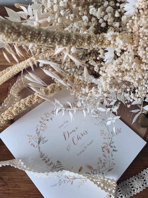 Bei meinem Brautstrauß habe ich mich für einen nicht typischen Strauß entschieden, sondern für einen hellen Trockenstrauß von Colvin – passend zu unseren Wedding Vibes. Damit ich ewig eine schöne Erinnerung auf dem Tisch stehen habe. Und auch dieser passte perfekt zu meinem Kleid.